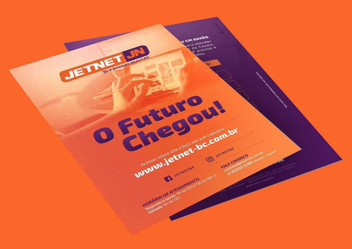 O projeto “JetNet – Site e Impressos” foi desenvolvido para a empresa de internet JetNet, localizada em Barão de Cocais/MG. O objetivo principal foi criar um site institucional e materiais impressos que reforçassem a identidade visual da marca e transmitissem confiança e profissionalismo aos clientes.